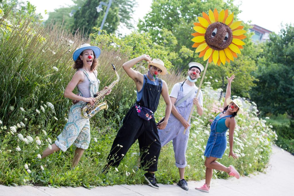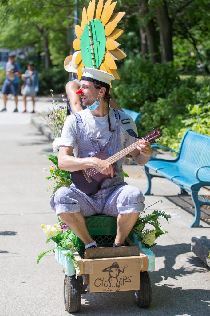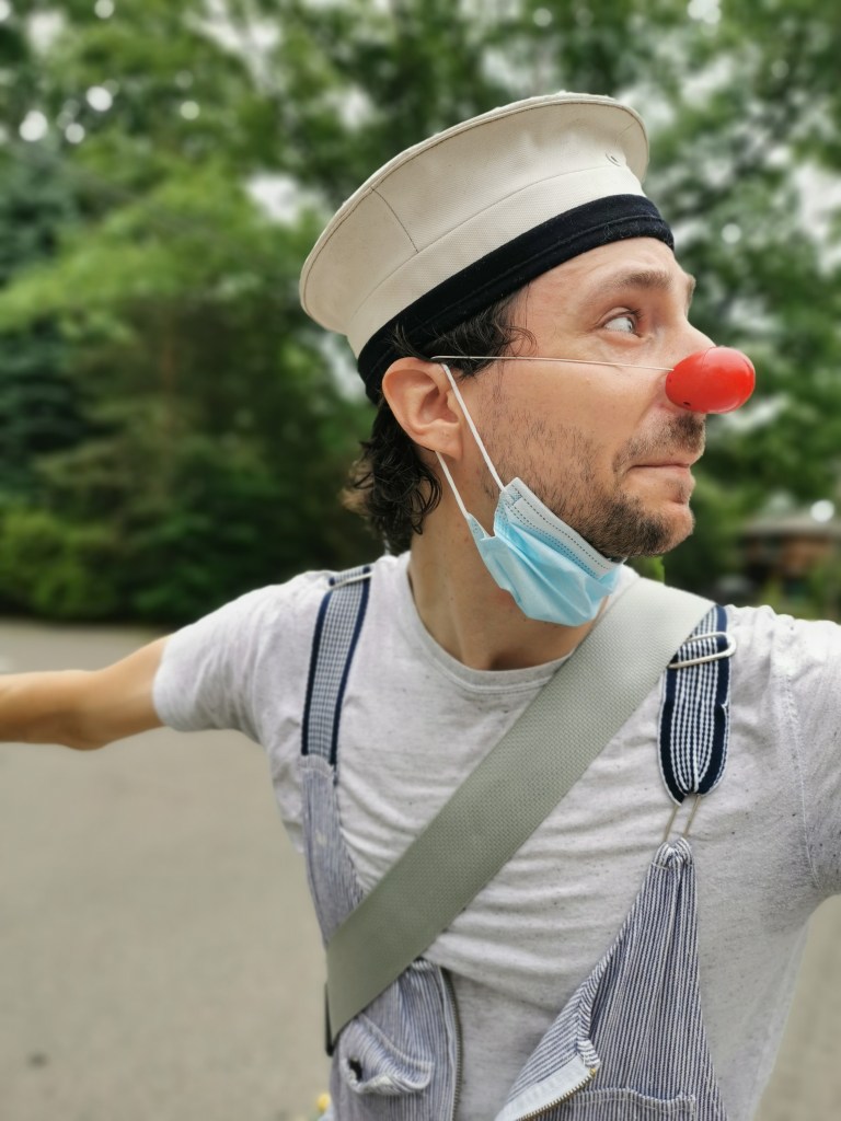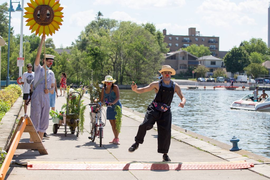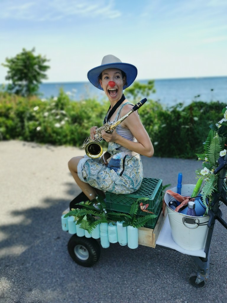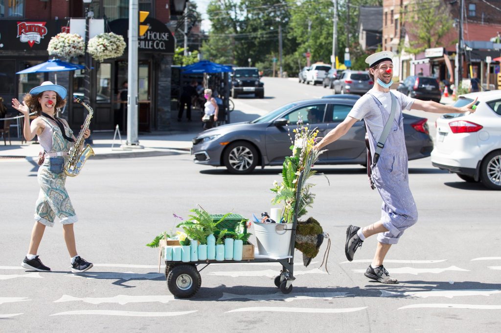 My group, the “Planting Queens” (a play on the Abba song “Dancing Queen” which became our silly anthem) were a wandering quartet of clown gardeners (because everyone took up gardening in 2020) designed to spread joy along the lakefront. Trowel (me), Sprinkle (Drew Berry), Fern (Rohan Dhupar) and Petal (Mackenna Martinez) wandered the streets of Port Credit from the piers of the harbour to the bridge across Cooksville Creek. We sang for, laughed with, cheered on cyclists and runners and greeted people we met on our way.