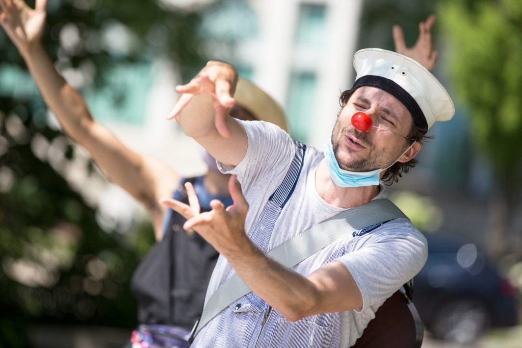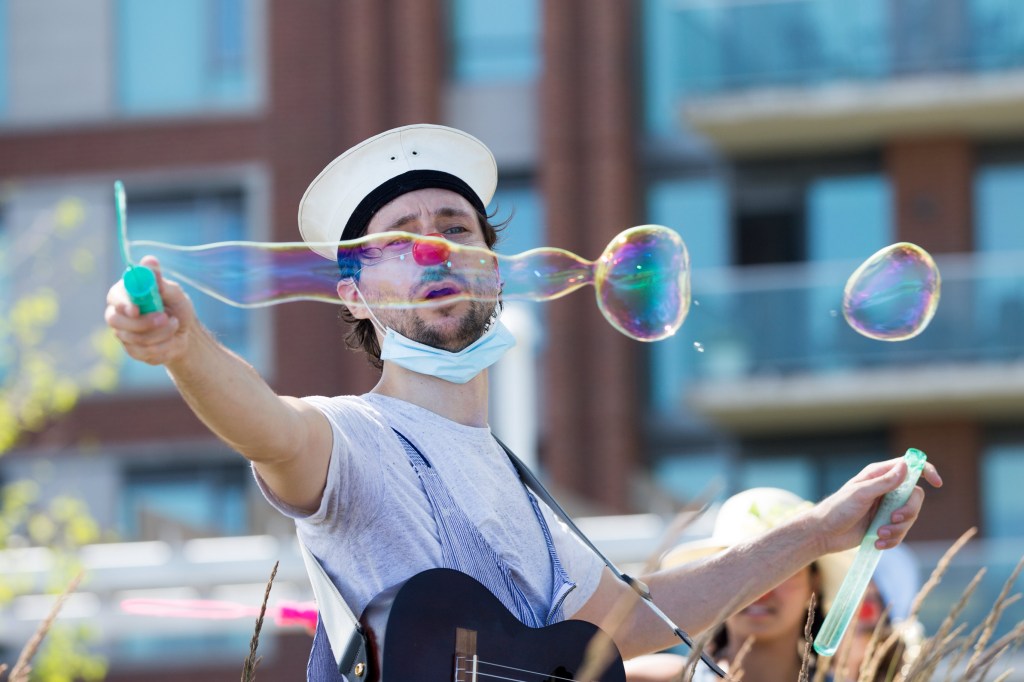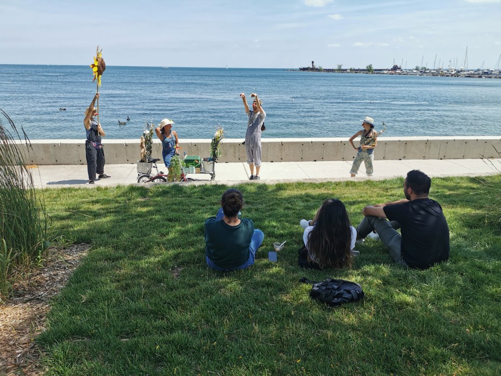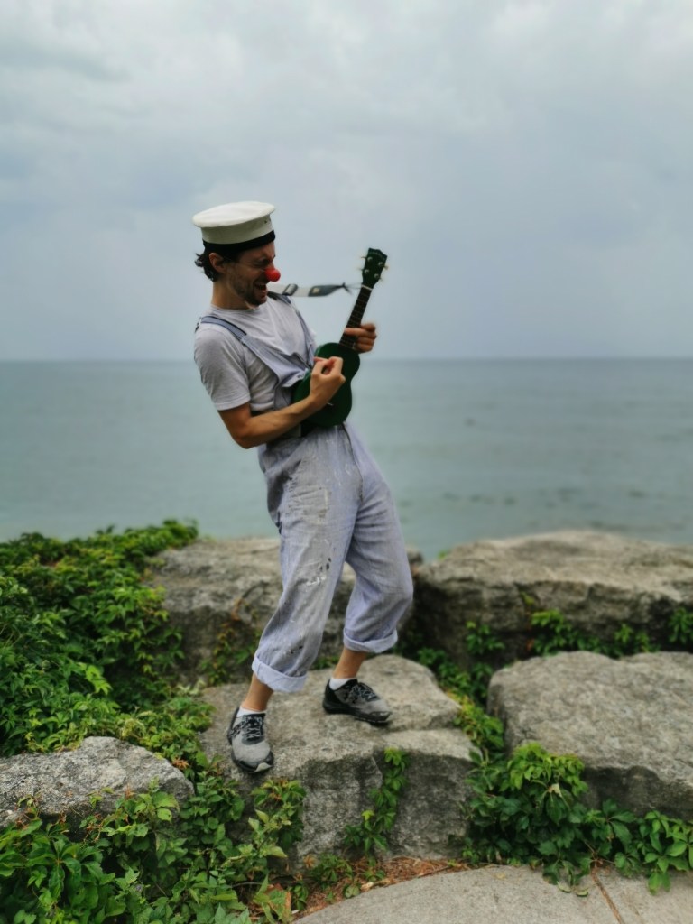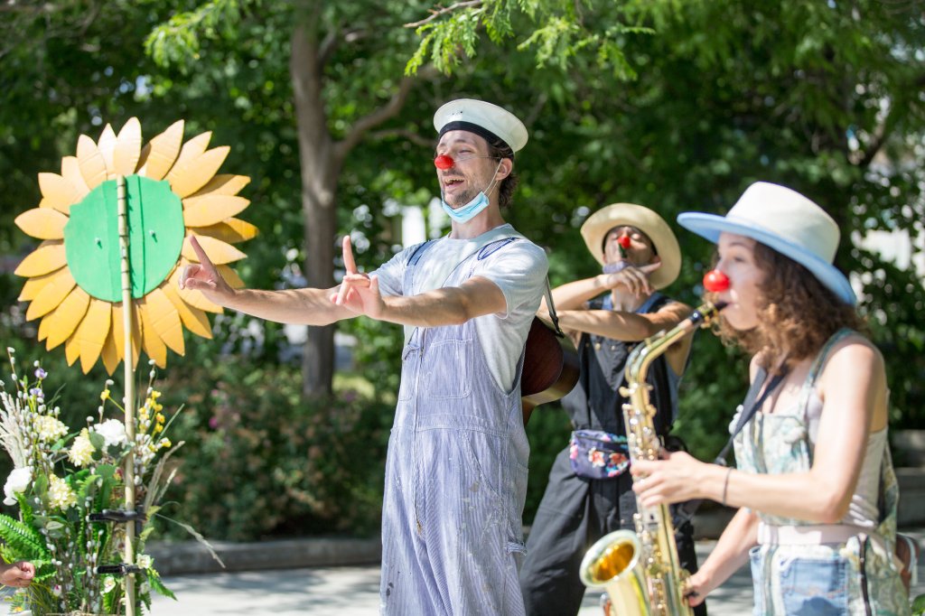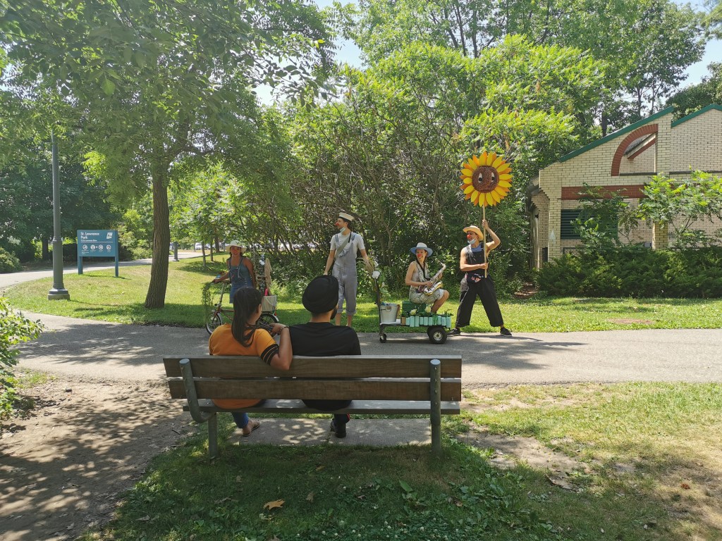 My group, the “Planting Queens” (a play on the Abba song “Dancing Queen” which became our silly anthem) were a wandering quartet of clown gardeners (because everyone took up gardening in 2020) designed to spread joy along the lakefront. Trowel (me), Sprinkle (Drew Berry), Fern (Rohan Dhupar) and Petal (Mackenna Martinez) wandered the streets of Port Credit from the piers of the harbour to the bridge across Cooksville Creek. We sang for, laughed with, cheered on cyclists and runners and greeted people we met on our way.