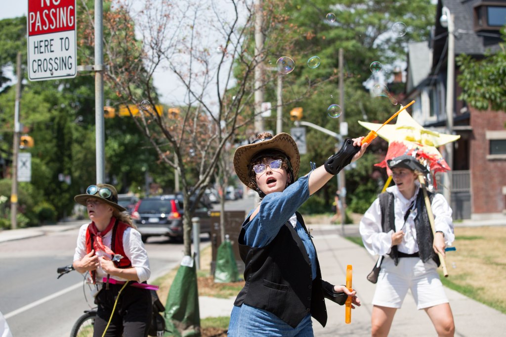 I did mention there were other Cyclops groups happening around the city at the same time ours was parading around Port Credit. Here’s a quick peek at Alice’s group, Space Force, with the wonderful Clarke Blair and Erin Eldershaw wandering the east end of Toronto: