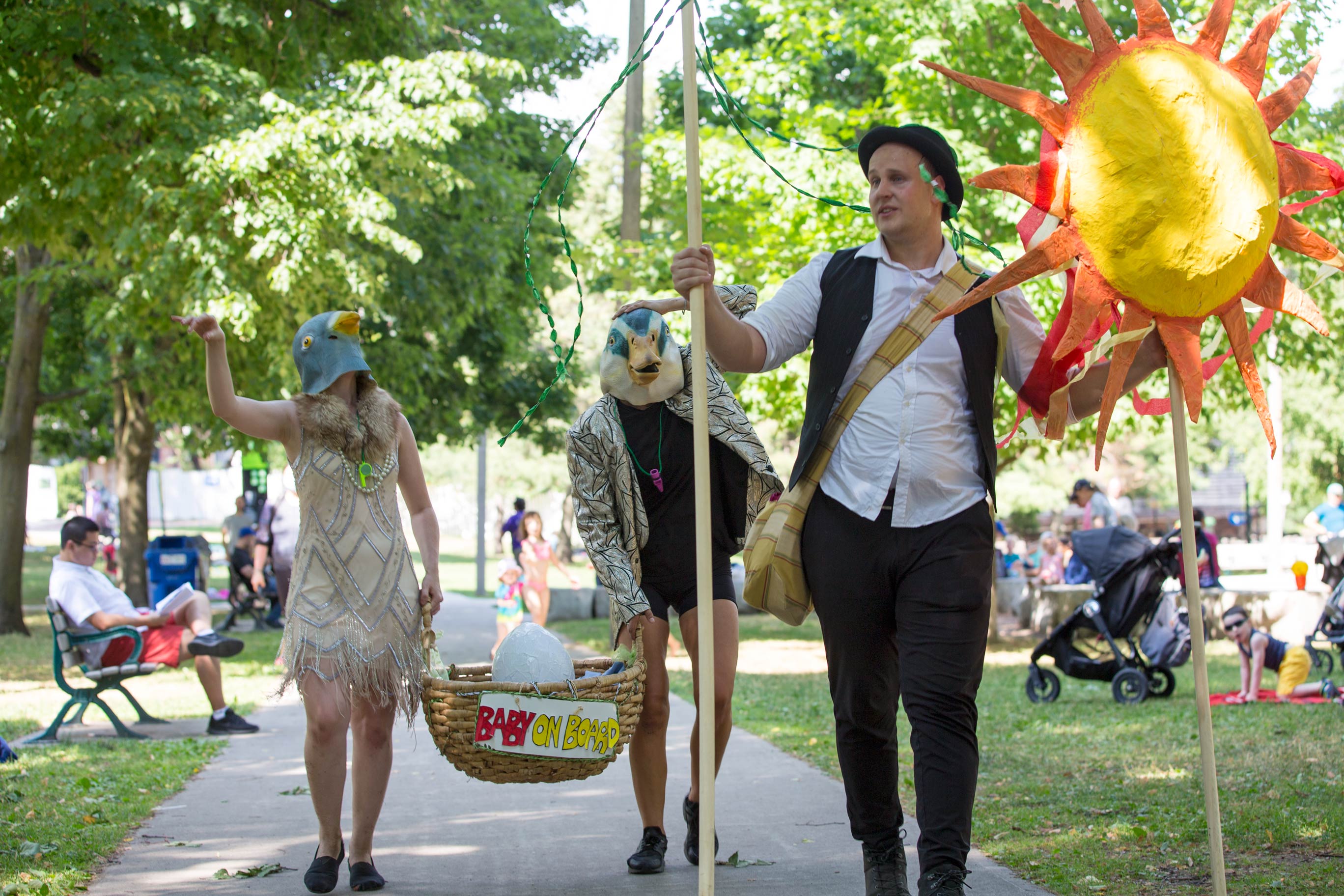 My friends David and Tamara of Clay & Paper Theatre wanted to offer a concept to us. Years before they had created the CYCLOPS, then known as the Cycling Oriented Puppet Squad, a mobile performance & parade designed to bring puppets to the people. They thought, why not open the concept up to make it more general, hence the Cycling Oriented PERFORMER Squad. Colleen, Alice and I, along with the Frog in Hand Summer Comapny, took the concept and ran with it. If we couldn’t bring people to gather, we might as well go to a place where gathering naturally happens: parks. And we would keep mobile.