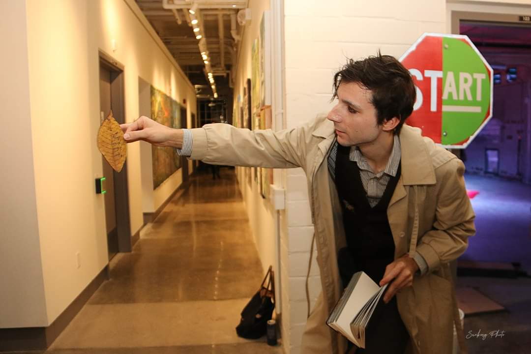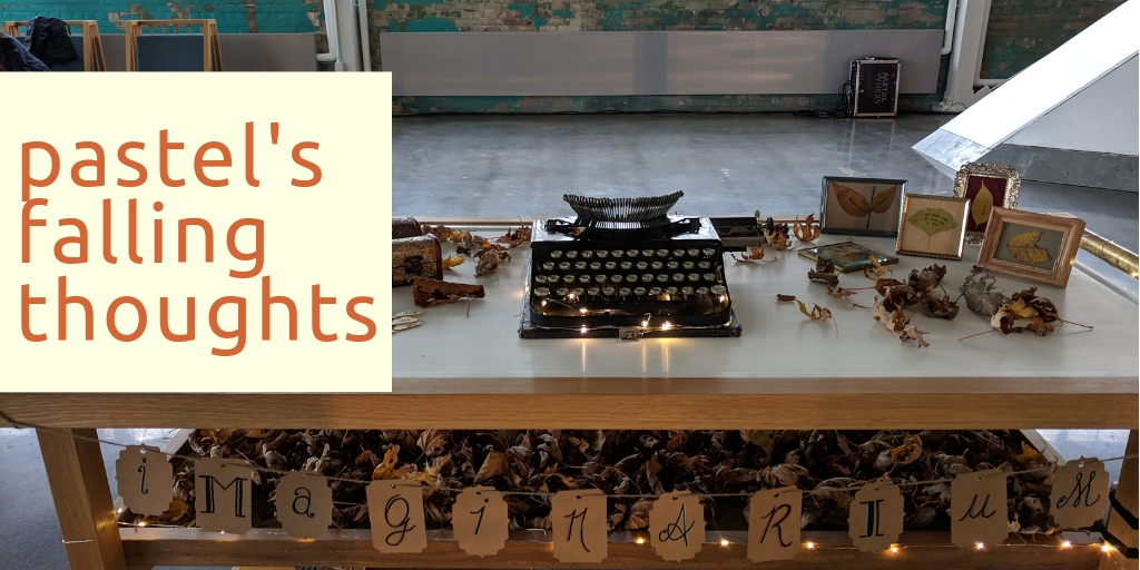 Enter the world of Pastel’s Falling Thoughts: Memories float delicately on the wind, or are buried, hidden within the leaves of a book. He will communicate if he can remember how, or at least share a bit of wisdom if he can recall where to find it. You can find Pastel outside, dancing amongst the leaves, a duet of a time threatened to be forgotten; or within, as he carries his imaginarium, the home of his ideas, from space to place, and sets up to release stories into the future.