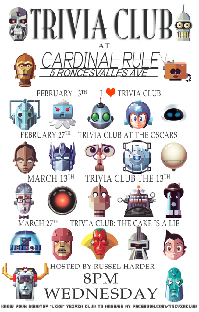Hope everyone knocked that question out of the park, and now want to go and watch The Princess Bride again. So yes, come out to Trivia Club at Cardinal Rule. It’s the second and now also fourth (usually the last) WEDNESDAY of each month, which means for both February and March you’ll have a chance to enjoy Trivia Club on the 13th and the 27th of the month! Then in April, on the 10th, Trivia Club will be celebrating its ONE YEAR ANNIVERSARY! So make sure to come out for that massive celebration that will be sure to give all the awesomeness of the past twelve months of trivia some due gravitas. I look forward to seeing you at Cardinal Rule, for the prizes, the knowledge, the great food, and drinks, and friends.